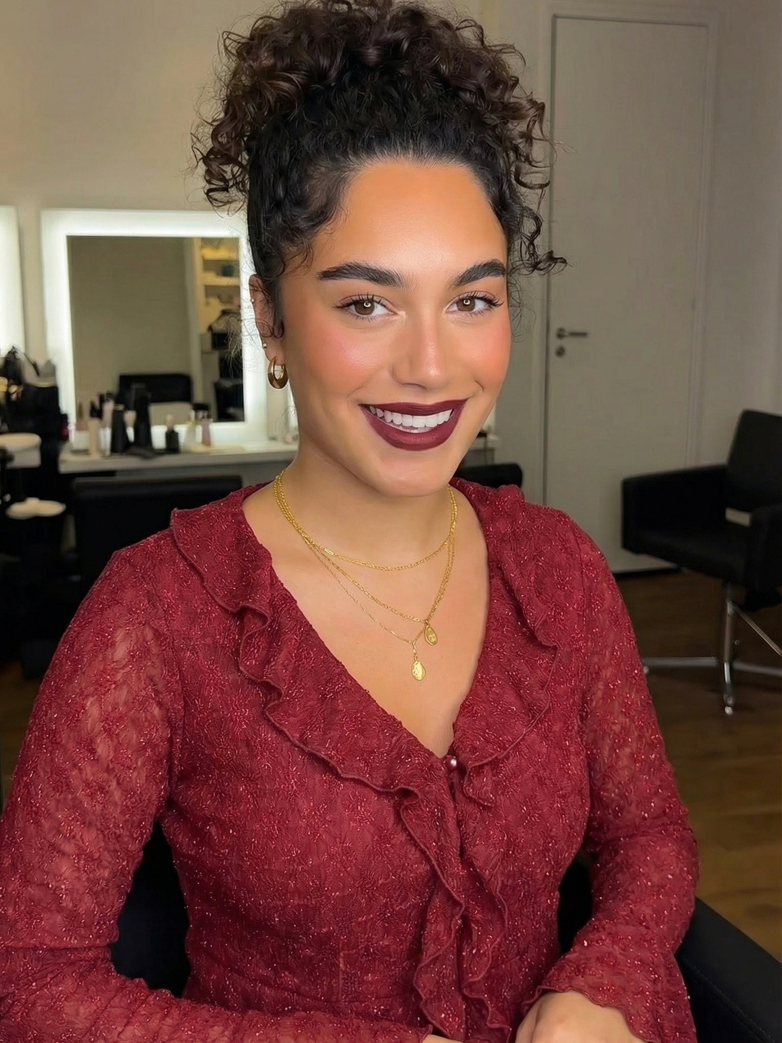 La Blusa Lola es una prenda de encaje en color burdeos, diseñada con mangas largas acampanadas que presentan botones al frente. Su volante frontal y en el cuello le aportan ese toque romántico , junto con un tejido de estiramiento medio, ofrecen comodidad y un ajuste favorecedor, ideal para diversas ocasiones.