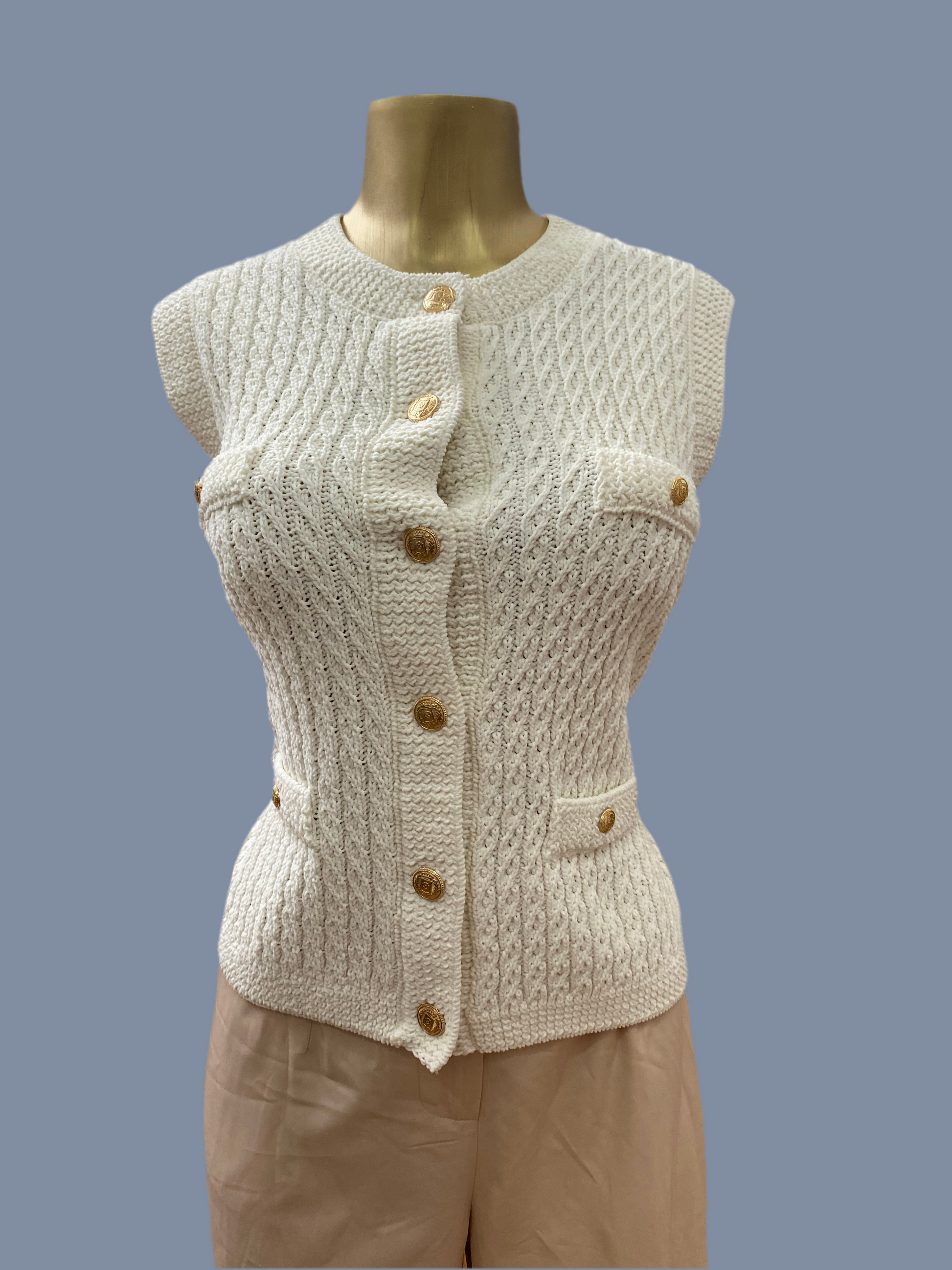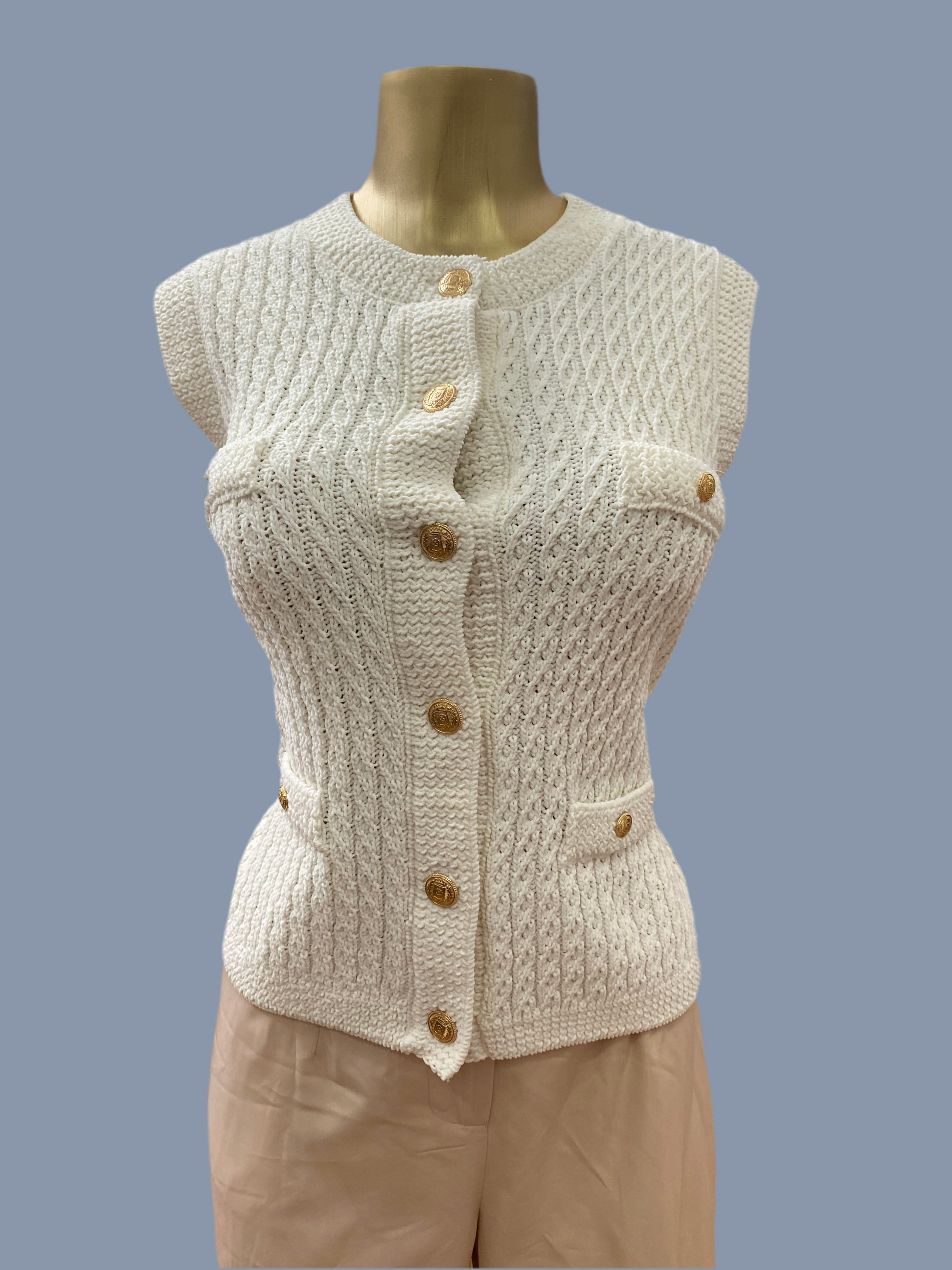 Descubre la elegancia y versatilidad del Chaleco Glenda en un tono marfil. Su tejido de textura delicada, junto con sus botones dorados, lo convierten en un básico sofisticado para tu clóset. Atemporal y chic, esta prenda es una adición imprescindible para cualquier atuendo.