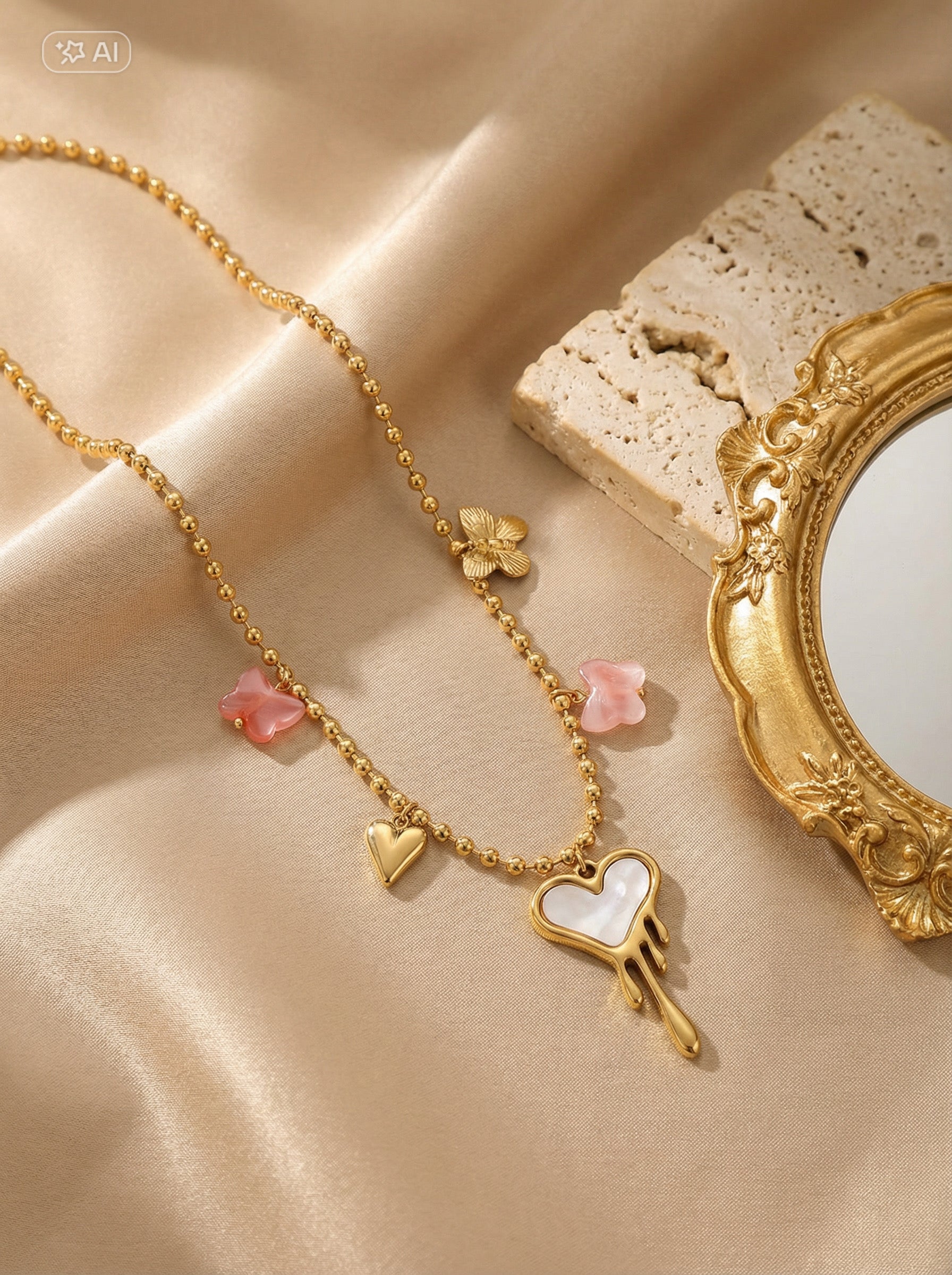 La Cadena Eliza presenta dijes de corazones y mariposas en colores vibrantes, diseñada para complementar atuendos con collares de diferentes capas. Su estilo sofisticado y actual permite a los usuarios elevar su apariencia, añadiendo un toque distintivo y moderno a cualquier conjunto.