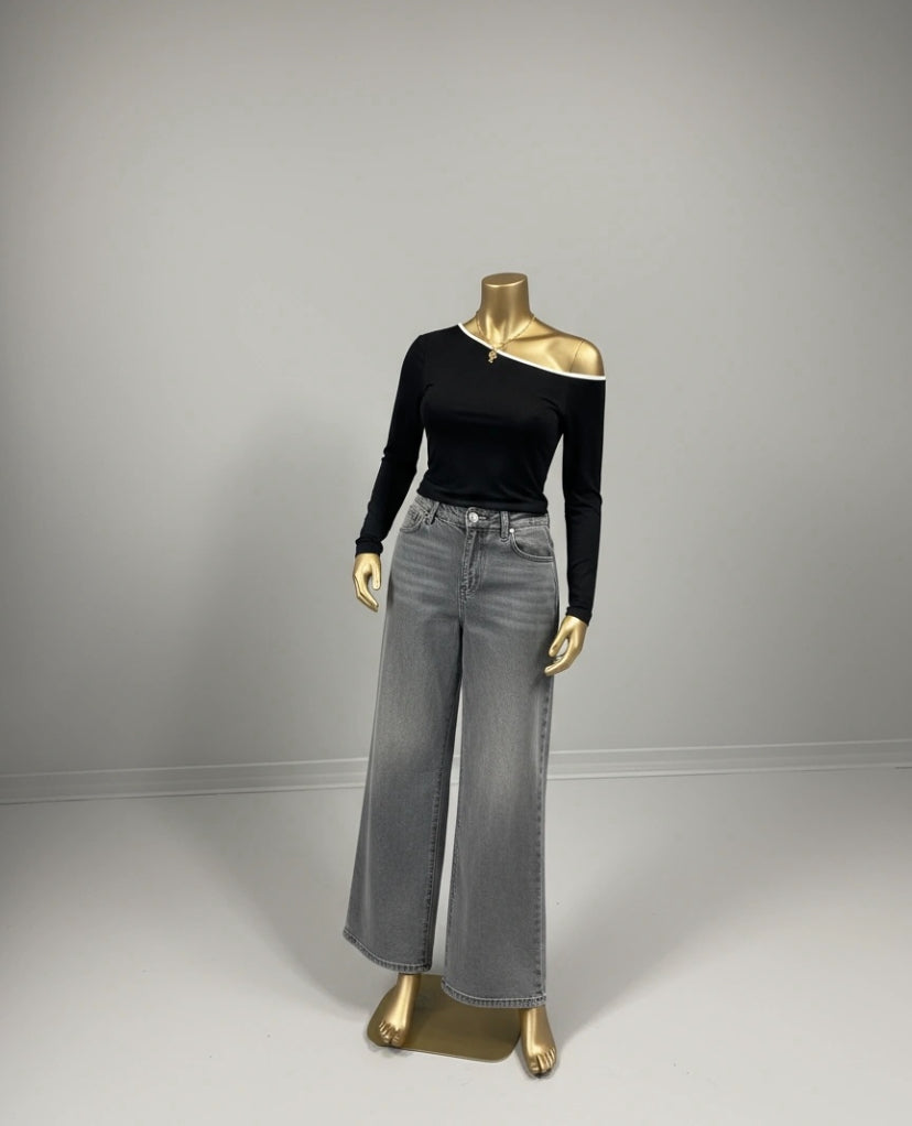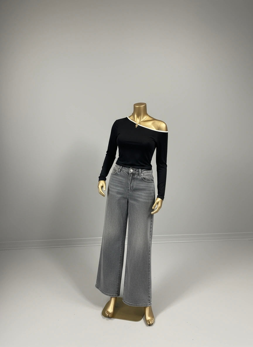 Top manga larga con escote asimétrico con una delicada línea blanca.