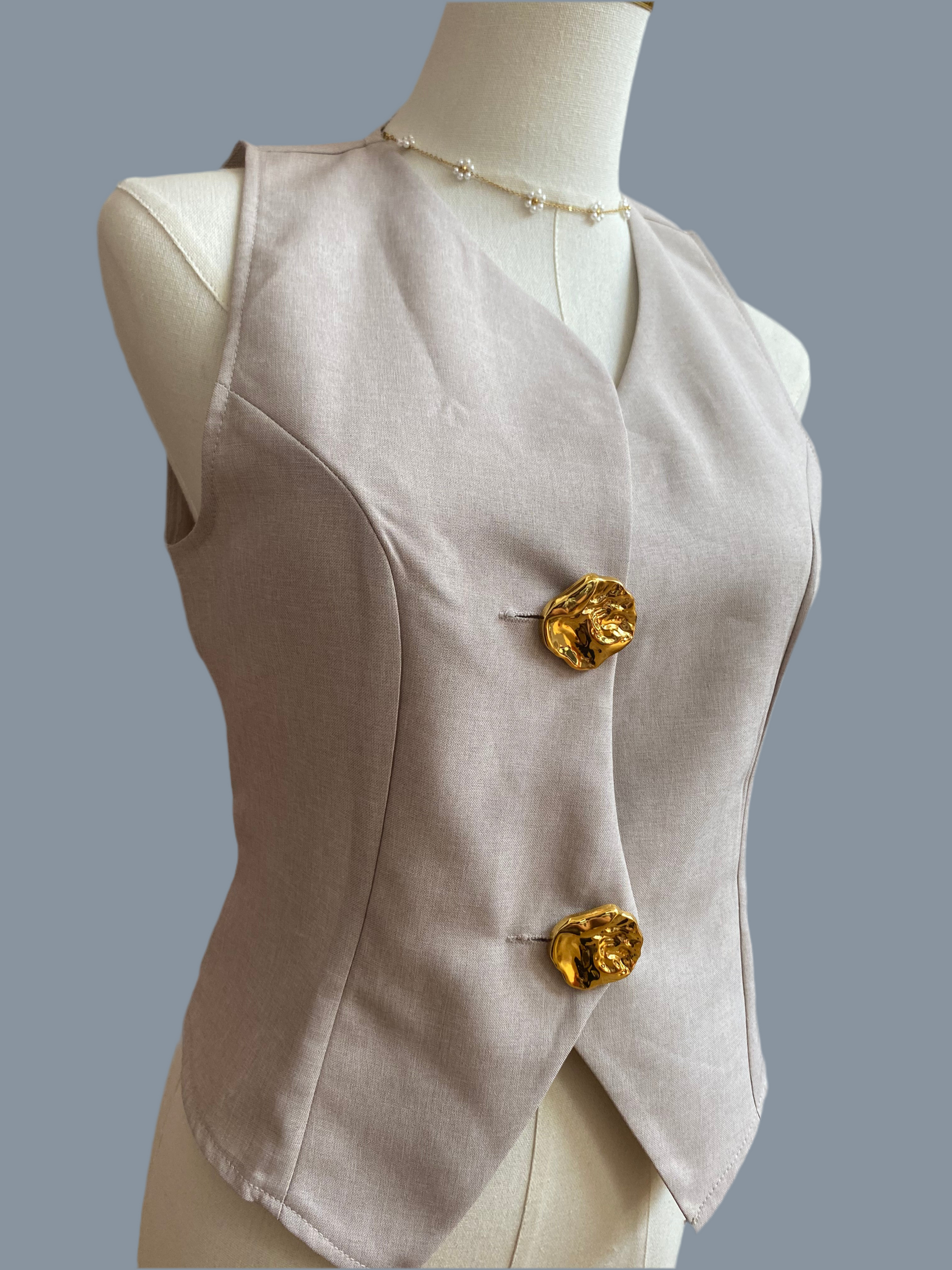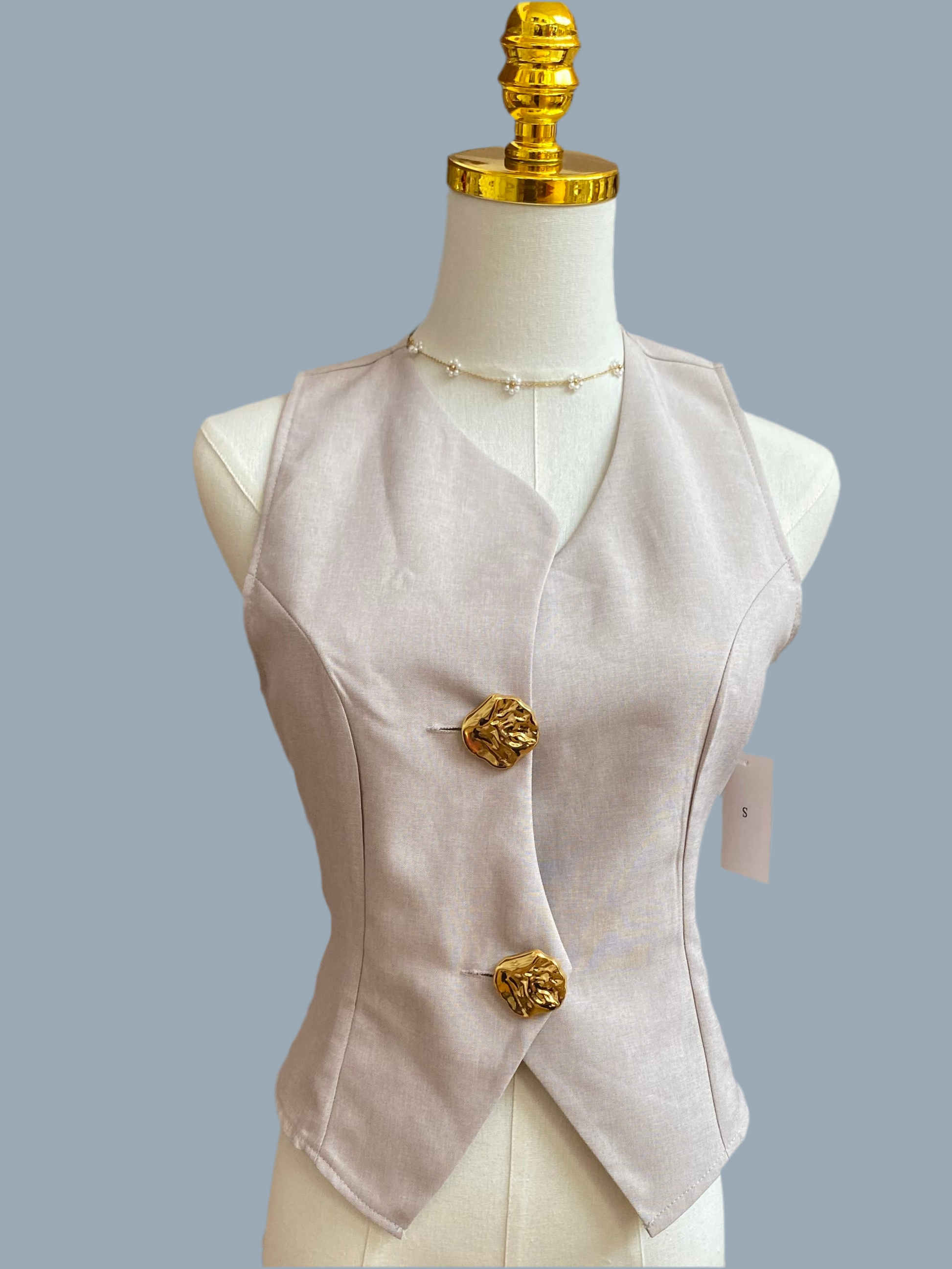 Top sin mangas asimétrico con dos botones dorados en frente.