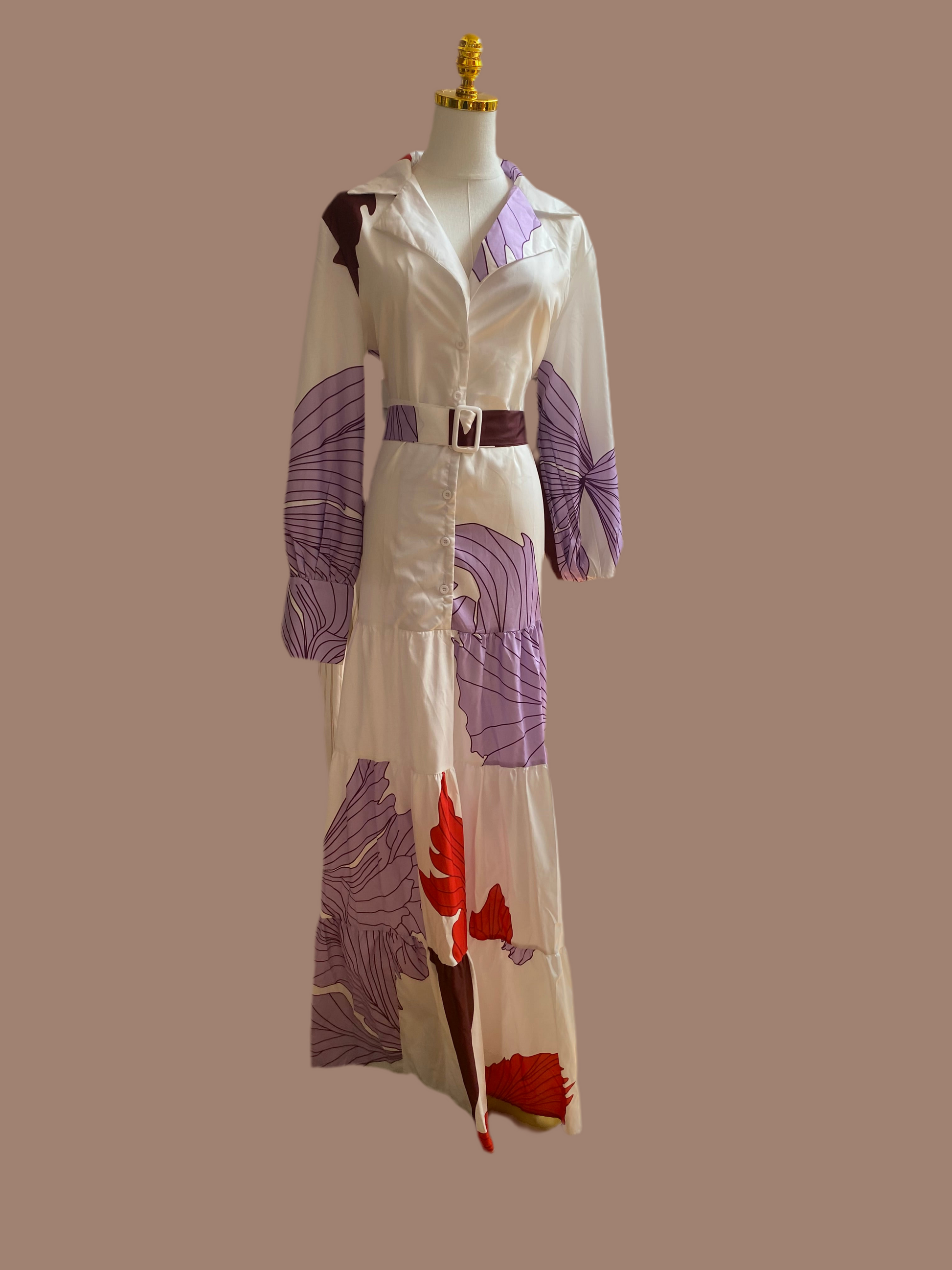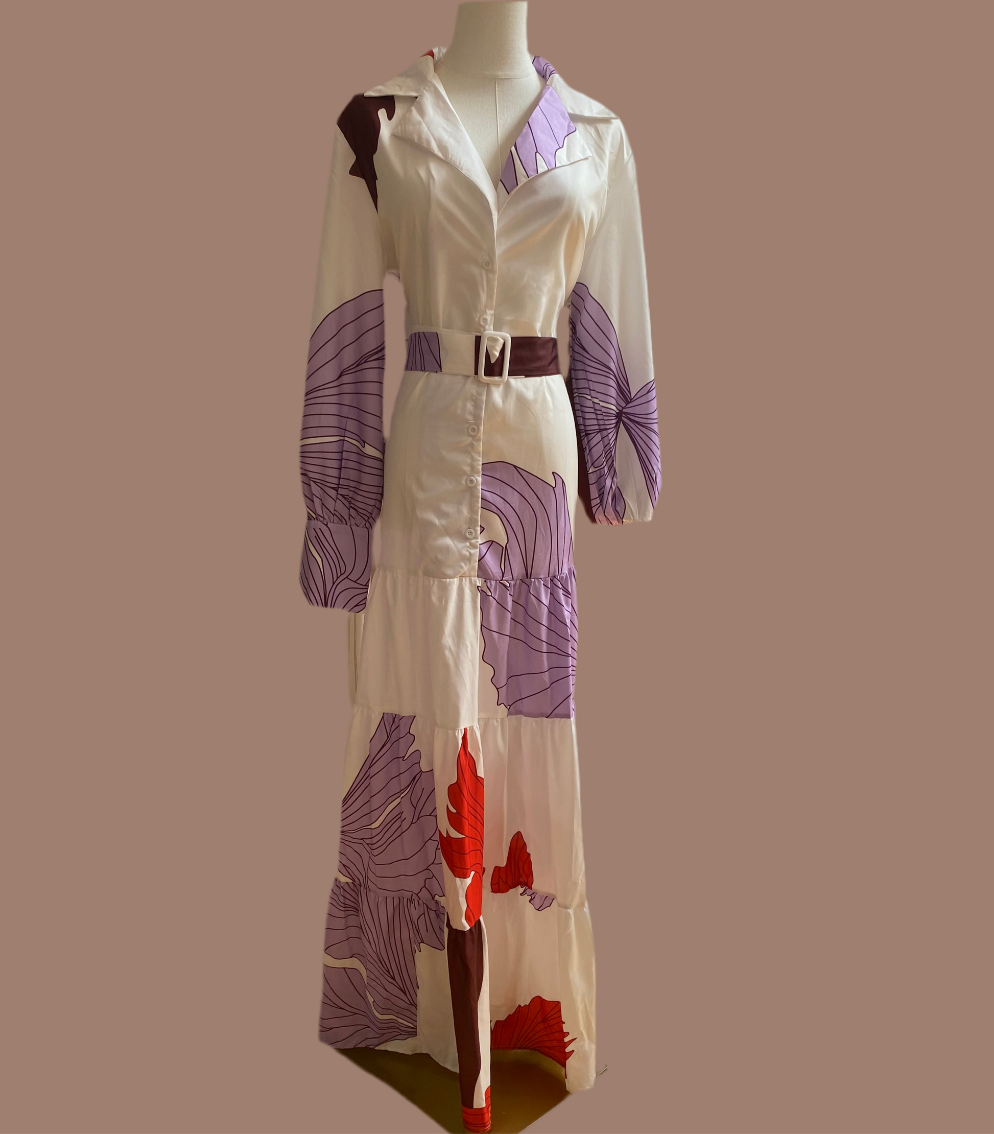 Este hermoso vestido Luisa es perfecto para cualquier ocasión. Con su largo cuello y mangas largas, te mantendrá abrigada y elegante. El estampado de flores grandes en lila y rojo le da un toque de color. Además, su cinturón te ayudará a acentuar tu figura. ¡Un vestido imprescindible en tu armario!